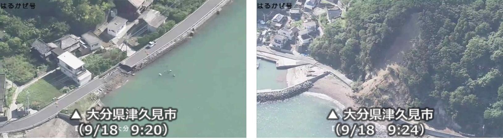 九州地方整備局が保有する防災ヘリ「はるかぜ号」で津久見市などの立入困難な被災現場を上空から調査。