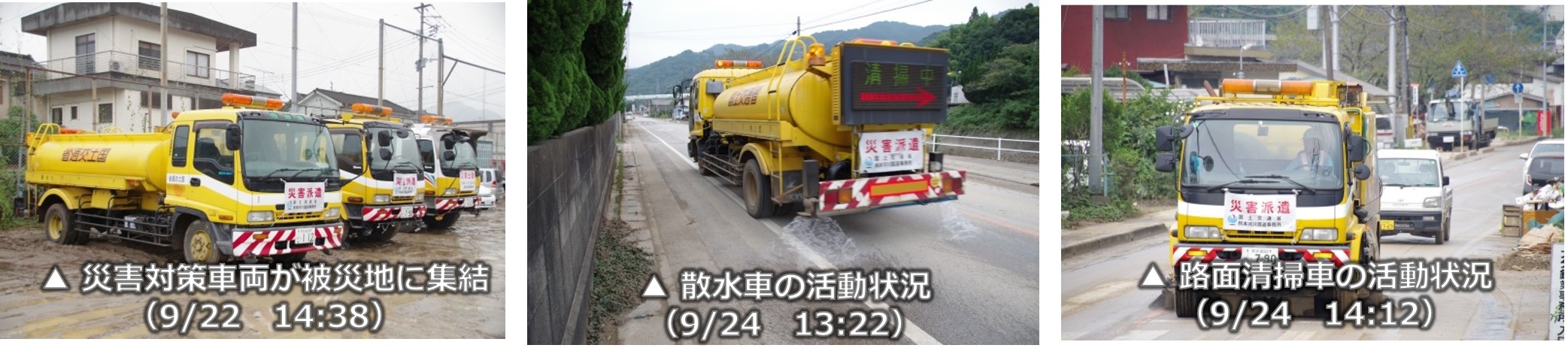 九州地方整備局が保有する路面清掃車、散水車を被災地に派遣し、自治体の災害復旧を支援します。