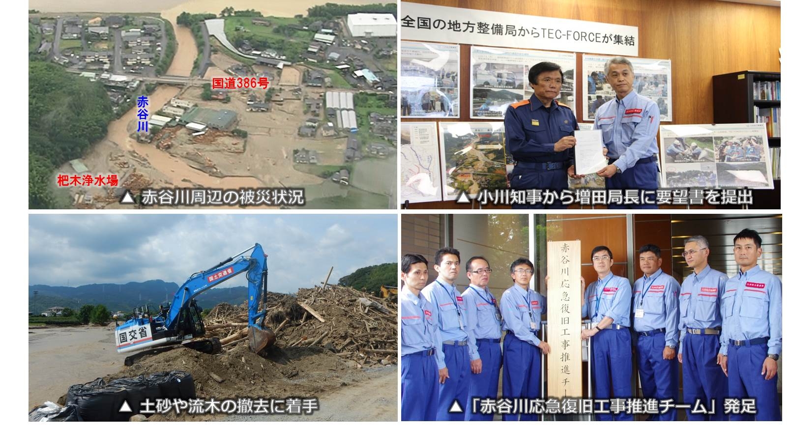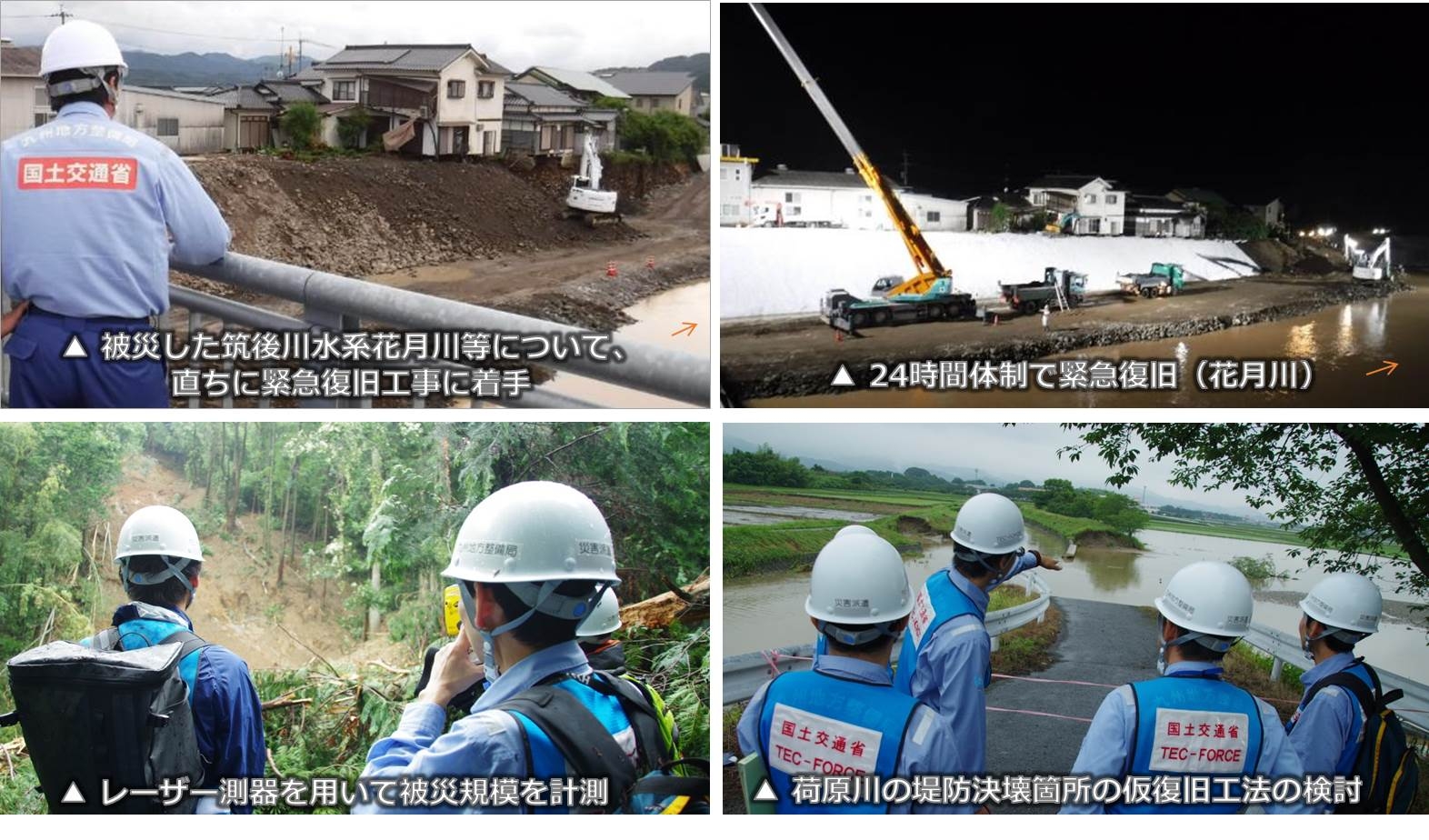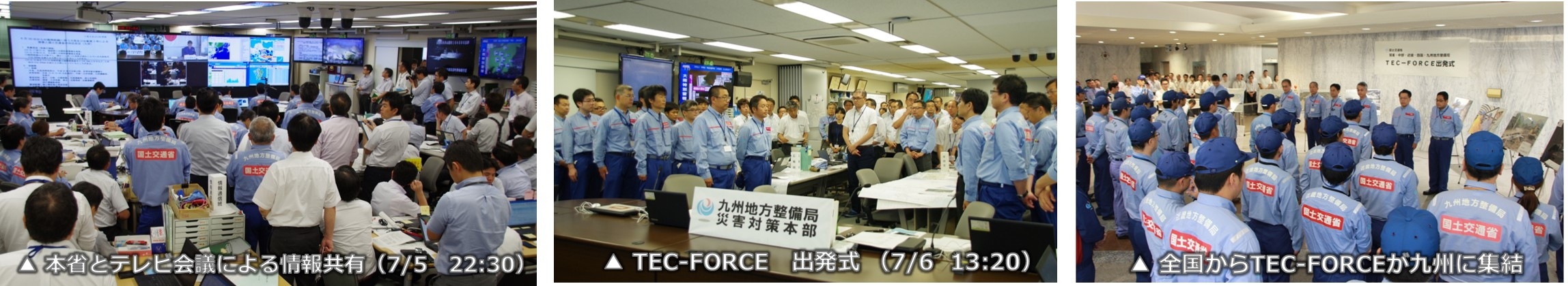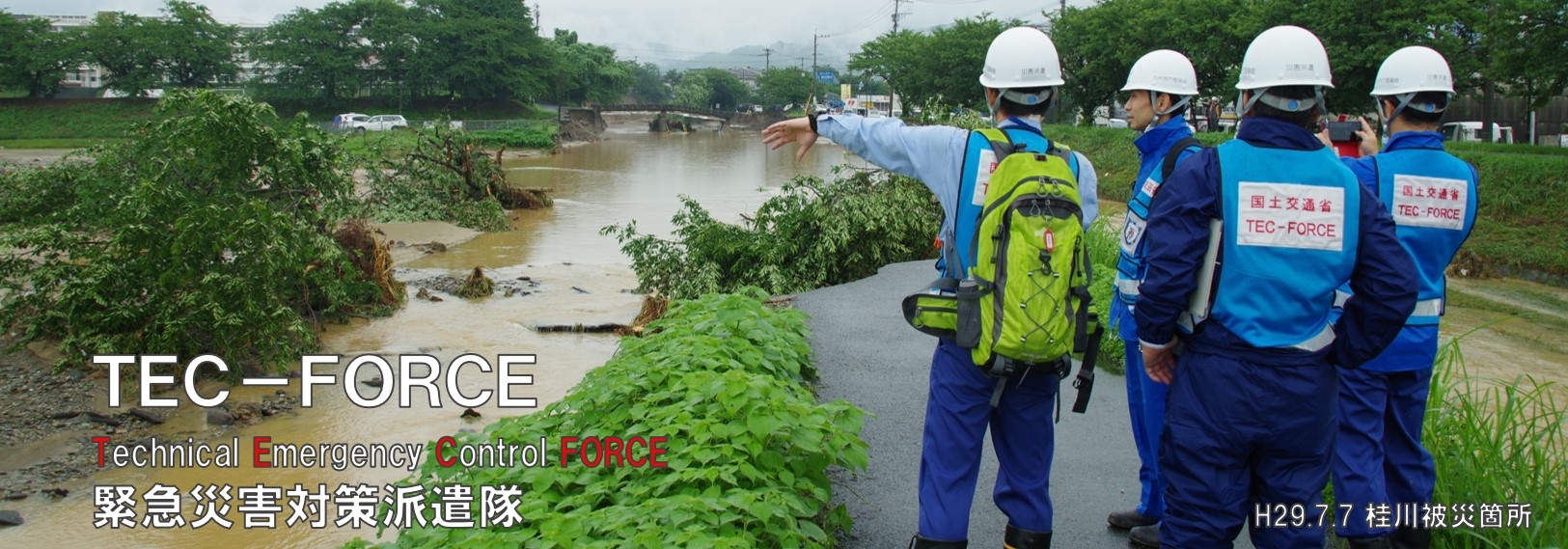 *TEC-FORCE(テックフォース(緊急災害対策派遣隊))とは、大規模自然災害が発生し、又は発生するおそれがある場合において、被災地方公共団体等が行う、被災状況の迅速な把握、被害の発生及び拡大の防止、被災地の早期復旧その他災害応急対策に関する技術的な支援を円滑かつ迅速に実施することを目的としたものです。