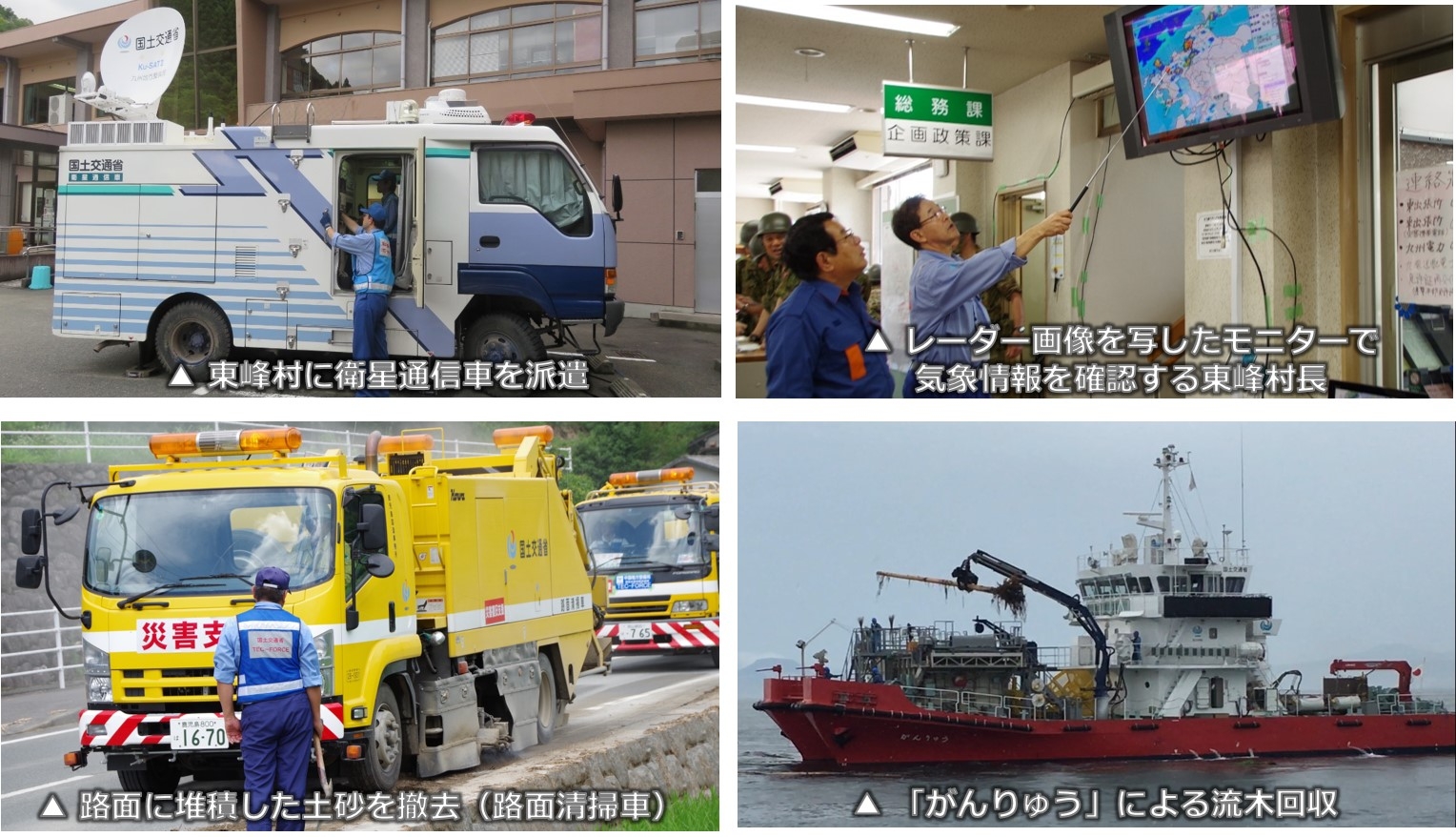 被災自治体の首長などに被災情報の提供や応急復旧に向けた技術支援を行うため、現地で活動するTEC-FORCE・リエゾンを統括する隊長として整備局の幹部職員を派遣し、調査結果をとりまとめて被災自治体へ報告しました。