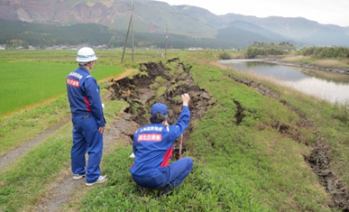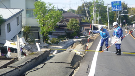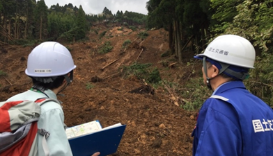 ![]() ▲被災現場での法面の復旧工法を技術的に検討(益城町) |