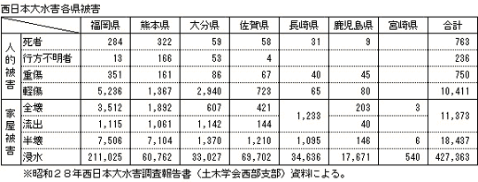 梅雨前線末期の停滞した湿舌により、九州北部から中部にかけては、累加雨量1,000mmを超える地点もあり、特に筑後川や白川を中心として、各地において、今だかってない記録的豪雨となり、死者・行方不明者999名など九州において最も悲惨な水害となった。
