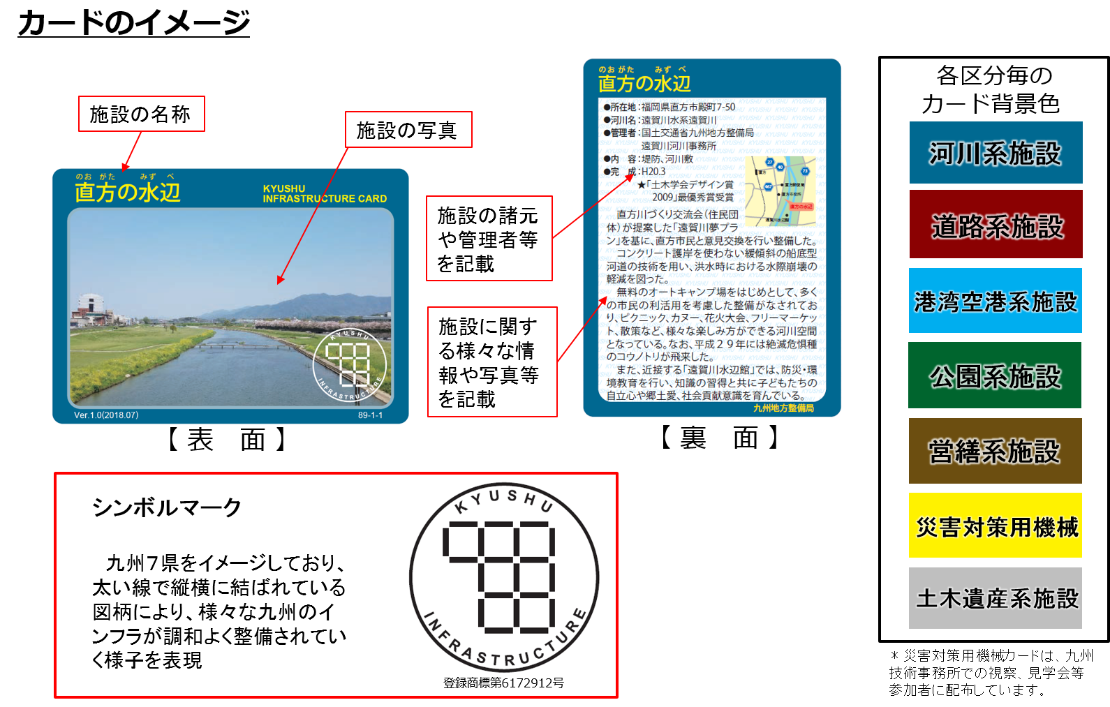○ 九州内のインフラ等の紹介およびインフラ観光、地域活性化の一助とするため、各施設の基礎的な諸元や役割等の情報を提供する簡易版パンフレットとして、統一的なデザインのカードを作成したものです。