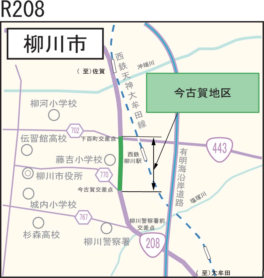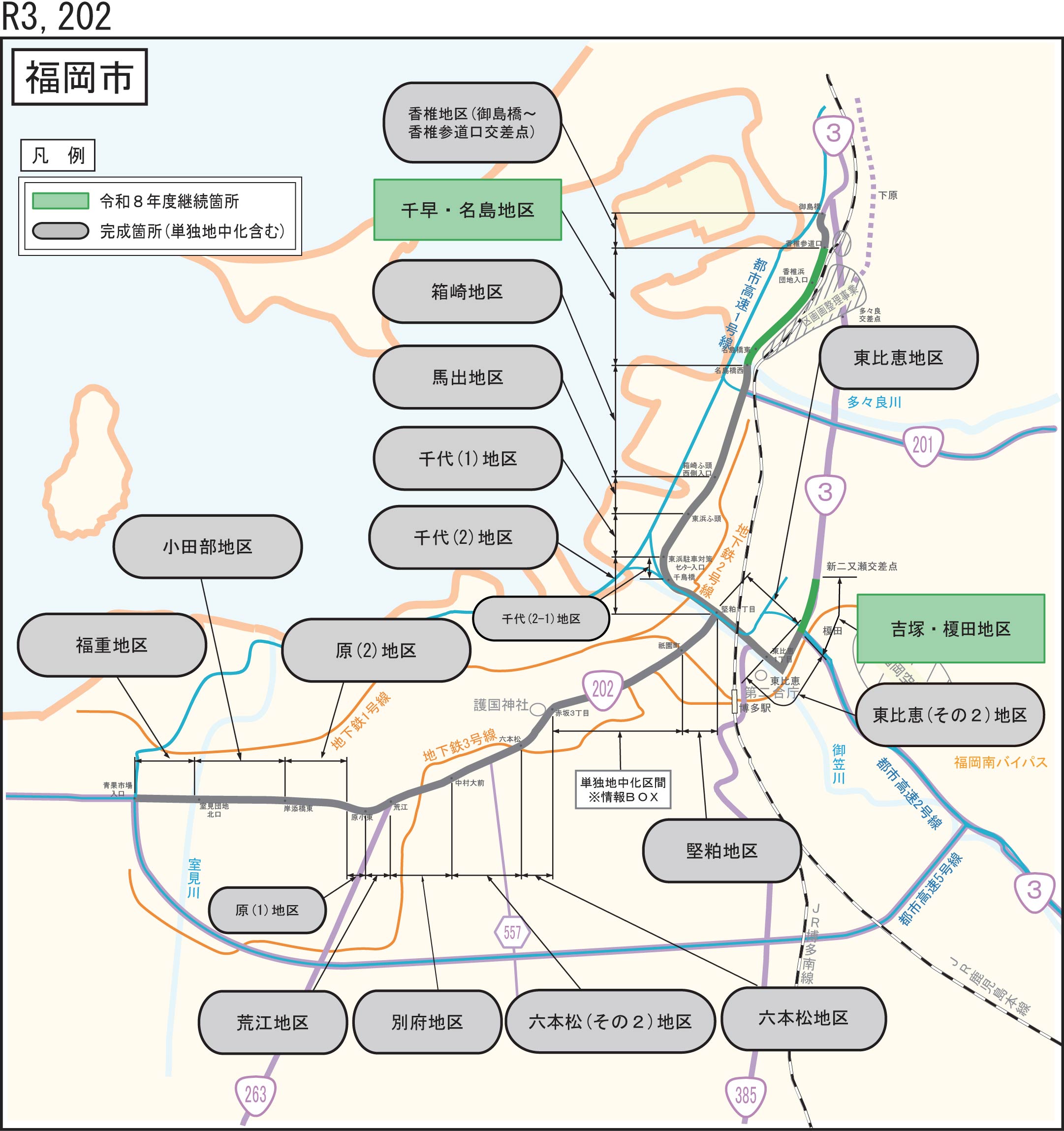 管内において、約23.9kmの無電柱化の整備が完了しており、現在、福岡市、久留米市、糸島市、大牟田市、柳川市、大川市、筑後市において約11.8kmの事業を実施中です。