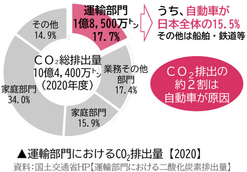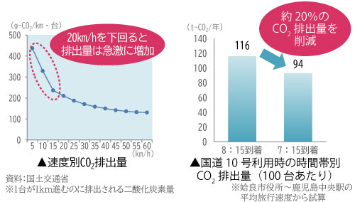 CO2排出量約2割は自動車が原因とされており、中でも渋滞時のCO2排出量は通常時の2倍以上と環境への影響が非常に大きくなっています。