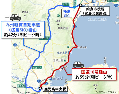 姶良市から鹿児島中央駅へ九州縦貫自動車道を利用して通勤した場合、高速利用料金は7,920円/月(平日朝夕割引適用による還元後※1)が掛かりますが、所要時間は1ヶ月あたり約7時間の節約ができます。