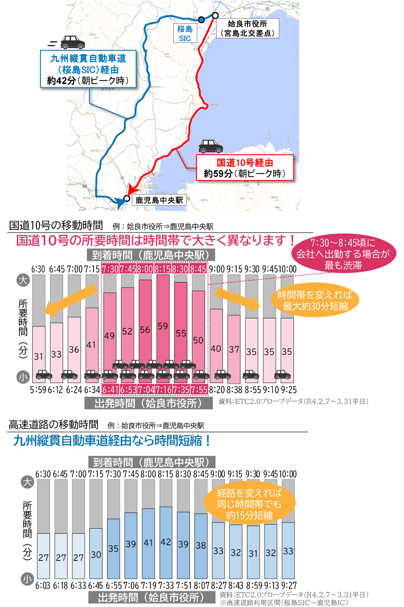 国道10号を利用して姶良市役所から鹿児島中央駅への移動の場合、出発時刻を変更することで、約30分の所要時間の短縮を図ることが可能です。
