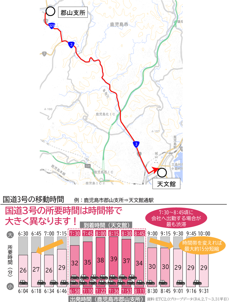 国道3号を利用し郡山支所から天文館通駅への移動の場合、出発時刻を変更することで約15分の所要時間の短縮を図ることが可能です。