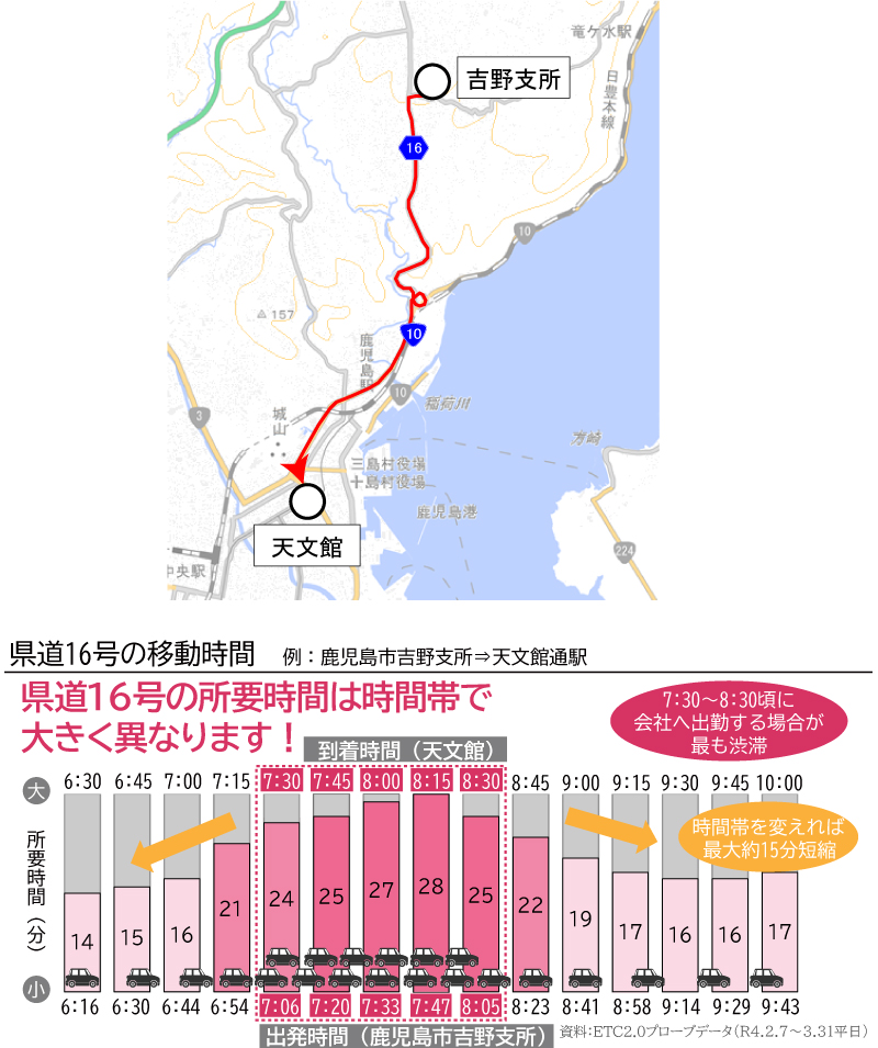 県道16号を利用し吉野支所から天文館通駅への移動の場合、出発時刻を変更することで約15分の所要時間の短縮を図ることが可能です。