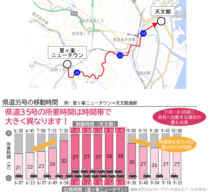 県道35号を利用し星ヶ峯ニュータウンから天文館通駅への移動の場合、出発時刻を変更することで約15分の所要時間の短縮を図ることが可能です。