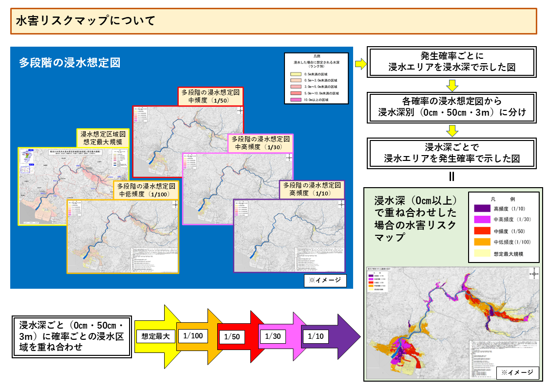 水害リスクマップは、年超過確率1/10・1/30・1/50・1/100・想定最大規模降雨の降雨により浸水した場合に想定される多段階の浸水想定図を重ね合わせたものであり、年超過確率ごとの浸水区域([浸水発生/浸水深50cm(床上浸水相当)以上/浸水深3m(1階居室浸水相当)以上])を示した図面です。