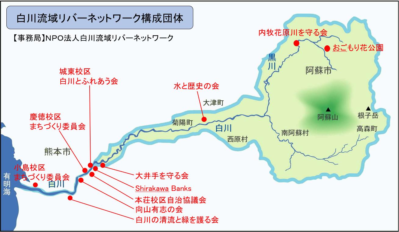 白川流域リバーネットワークは、平成14年に設立され、良好な流域・川環境・水環境を保全・創造するために白川の河口から上流阿蘇カルデラまでの白川流域において川の愛護活動、環境保全活動、地域づくり活動等を実施する住民団体等11団体で構成され、相互に情報交換と人的交流を行い、官民の連携・協働体制により活動することにより、川とともに人・文化を創る豊かな地域社会の実現に寄与していくことを目的として活動しています。