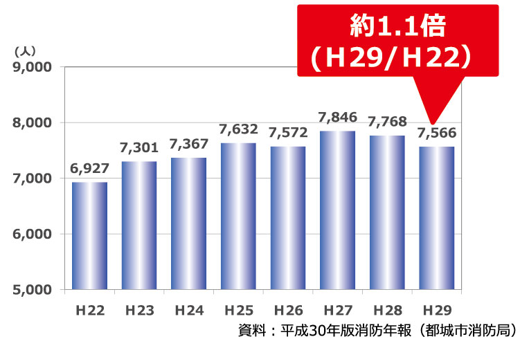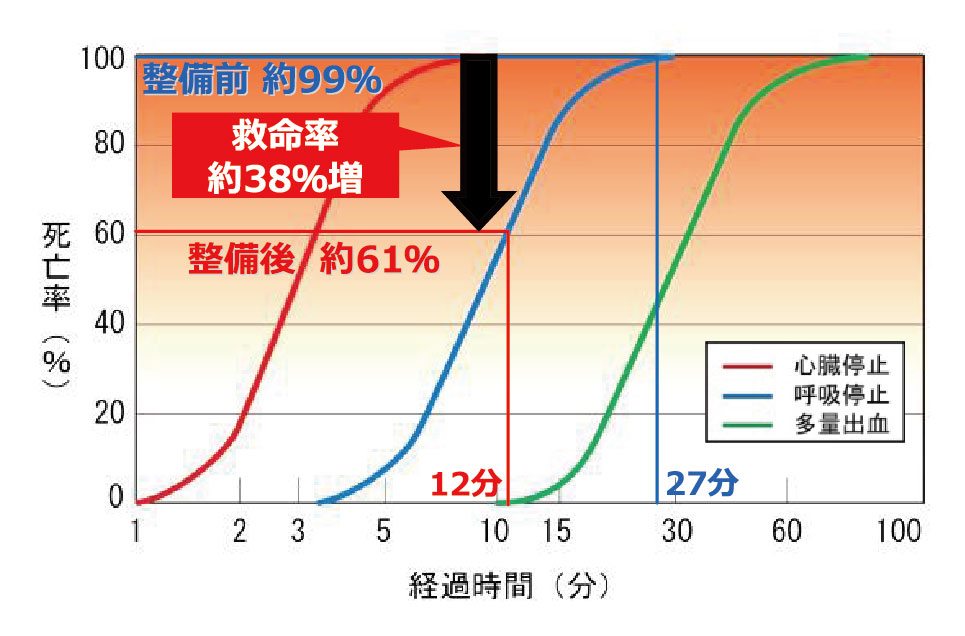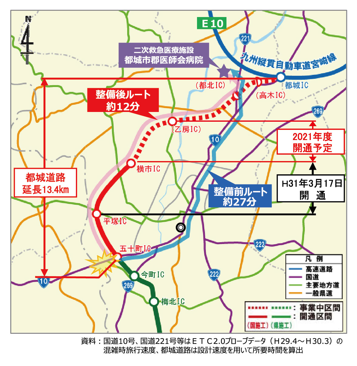 ・都城市の救急搬送者数は、平成22年に比べ約1.1倍の伸びを示しています。本路線の整備により、高次医療施設への搬送時間短縮が図られるとともに、搬送時の揺れや振動も押さえられ、患者の安静的な搬送が期待されます。