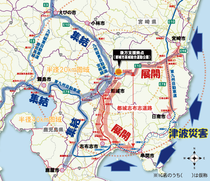 ・都城市高城総合運動公園は、大規模災害時における被災地での医療救護活動や、その後の復旧活動等を的確に行うための「後方支援拠点」を有しています。内部に位置する本路線の整備により、津波災害等による被災地へ展開するための道路として機能することが期待されます。