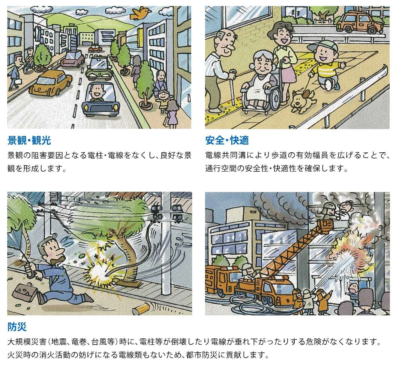 電線共同溝は、「景観・観光」、「安全・快適」、「防災」の観点から推進しています。
