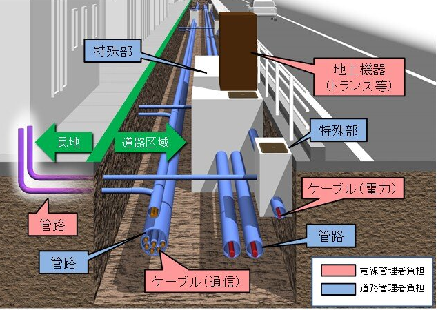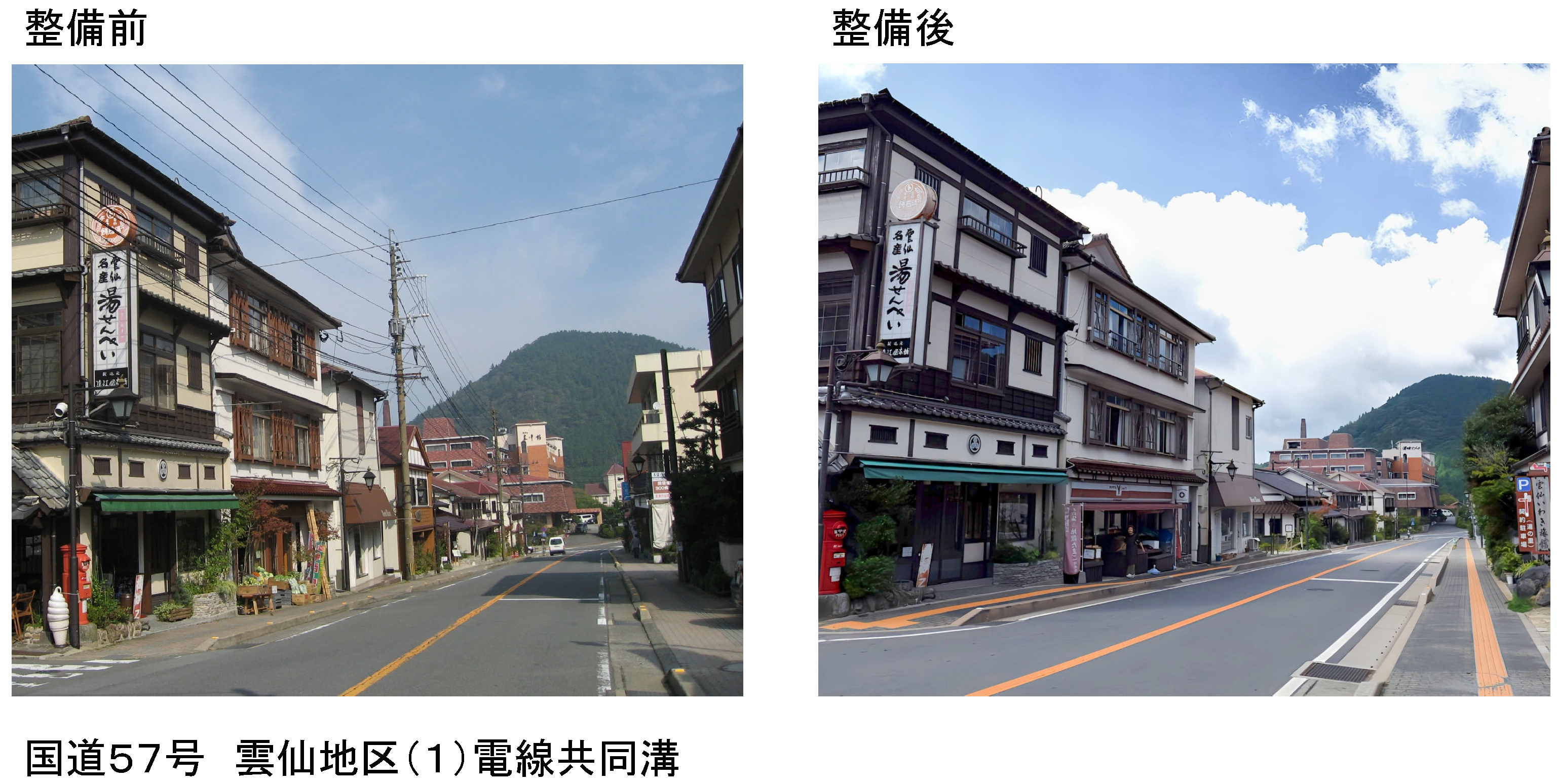 当該地区は、佐世保市中心部の家屋や商業施設等が密集する地域に位置するとともに、防災拠点である佐世保市役所及び災害拠点病院である佐世保市総合医療センターと西九州自動車道佐世保中央ICへのアクセス区間に位置しています。電線共同溝を整備し無電柱化することで、災害時における緊急輸送道路の確保並びに安全で快適な歩行区間の確保を図るとともに、良好な都市景観の形成に向けたまちづくりを支援していきます。 |