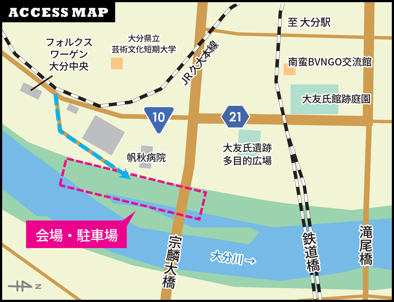 - 当日は大分川河川敷に無料駐車場を開放します。会場までの車の進入経路を十分にお確かめのうえ、ご来場ください。