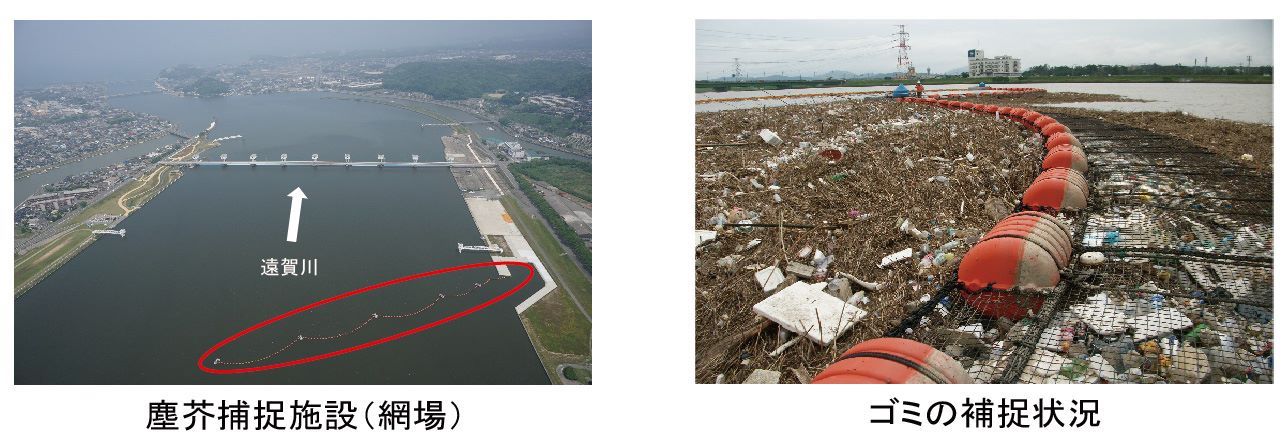 毎年、出水期には大量の塵芥が上流から遠賀川河口堰や河口周辺に到達し、流れてくる塵芥が、河口堰ゲートに衝突し損傷を与えたり、操作の支障になるのを防ぐため、平成25年3月から、遠賀川河口堰の上流250m付近に、長さ203mの塵芥捕捉施設(網場)を運用しています。
