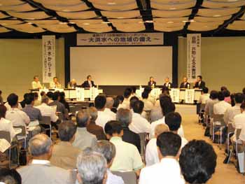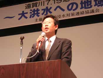 昨年7月19日福岡県北部の筑豊地方で、梅雨前線による局地的集中豪雨が発生し、飯塚市では1時間に83mmという昭和11年の観測開始以来の猛烈な雨を記録しました。この出水により遠賀川の支川・明星寺川などで越水がおき、あふれ出した水は飯塚市内中心部に流出しました。幸い、人的被害はありませんでしたが、商店街が水に浸かり商品が全滅になるなど地域経済に大打撃を与えました。昨年の出水から1年目を迎える平成16年7月19日に飯塚市のコスモスコモンにおいて「遠賀川7.19地域防災シンポジウム」を開催しました。 |