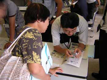 シンポジウム終了後、携帯電話から河川情報を入手する方法として、遠賀川河川事務所職員が携帯電話にアドレスの入力やブックマークへの登録及びホームページ内での情報の見方などを説明するコーナーを設置したところ、住民の方々は熱心に説明を聞かれていました。