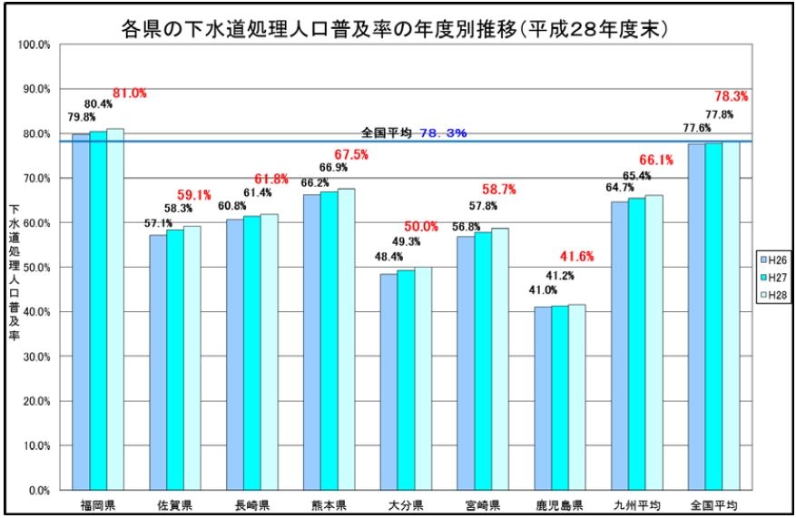 - 平成28年度末の九州の下水道処理人口普及率が66.1%になりました。