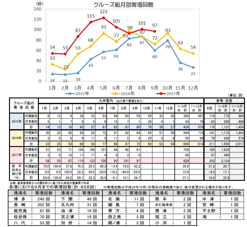 - 2017年9月までの九州管内港湾におけるクルーズ船寄港回数は、前年同期比37.1%増の828回。
