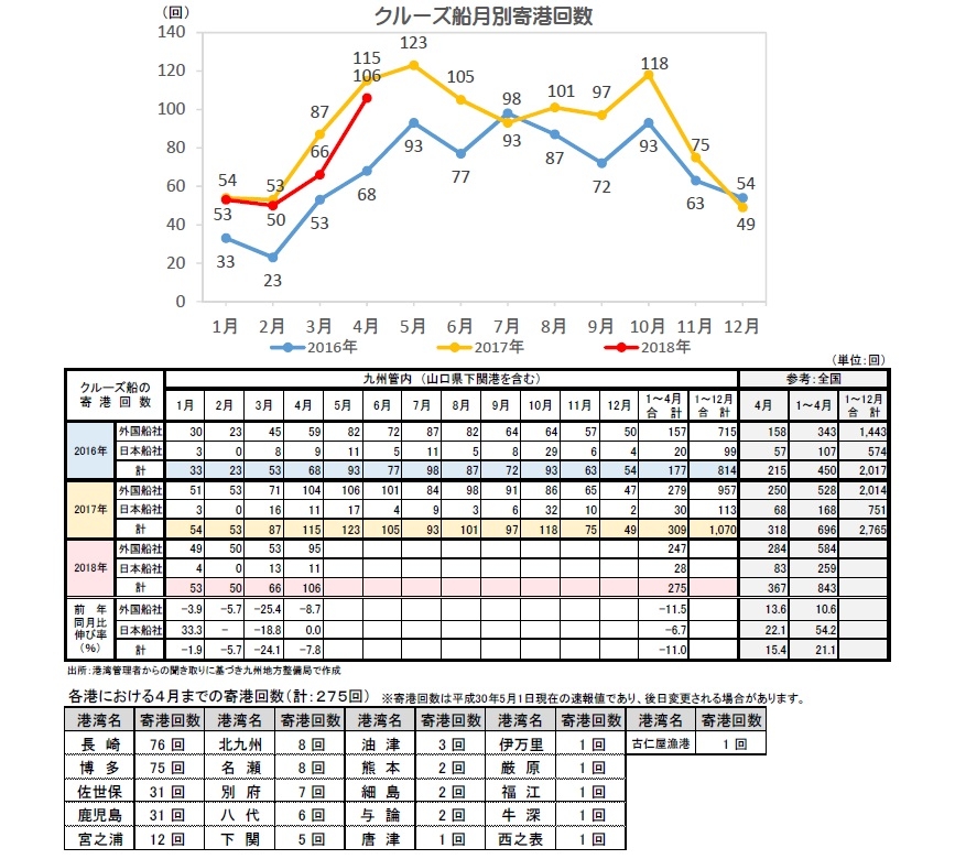 ・2018年4月の九州管内港湾におけるクルーズ船寄港回数は、前年同月比7.8%減の106回。