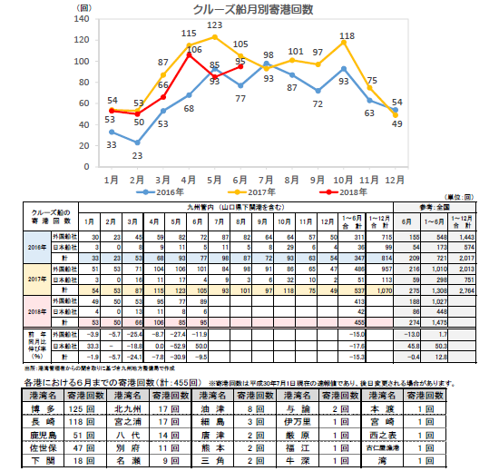 ・2018年6月までの九州管内港湾におけるクルーズ船寄港回数は、前年同期比15.3%減の455回。