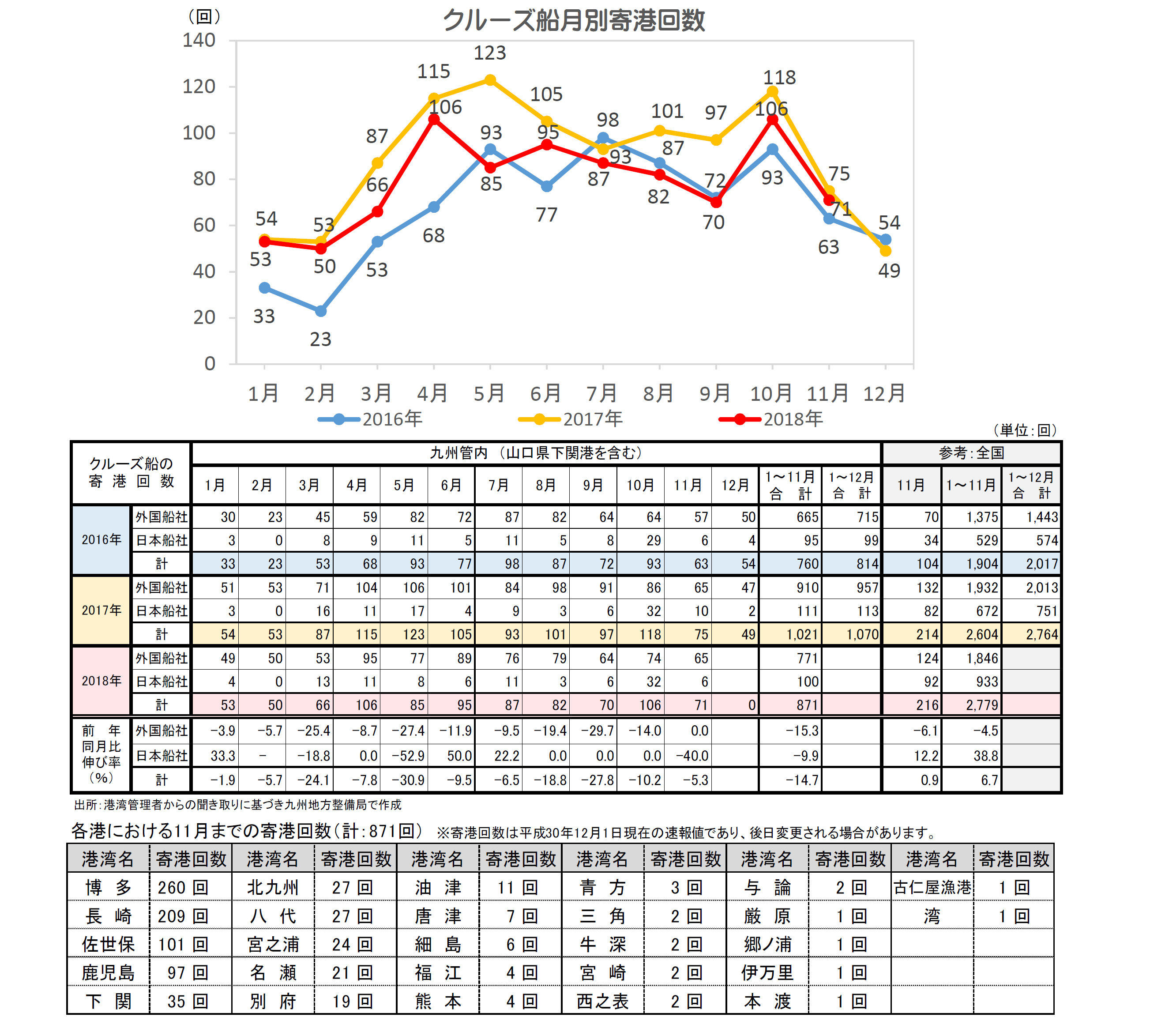 ・2018年11月の九州管内港湾におけるクルーズ船寄港回数は、前年同月比5.3%減の71回。