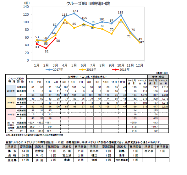 ・2019年3月の九州管内港湾におけるクルーズ船寄港回数は、前年同月比12.1%減の58回