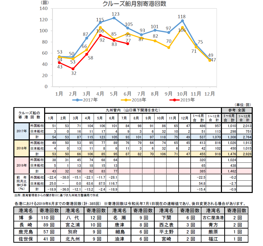 ・2019年6月の九州管内港湾におけるクルーズ船寄港回数は、前年同月比18.9%減の77回。
