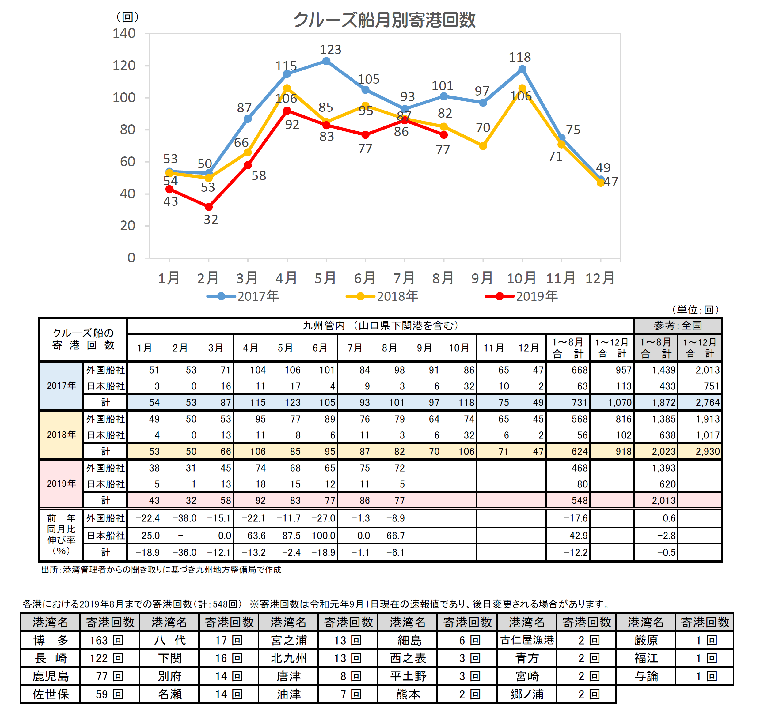 ・2019年8月の九州管内港湾におけるクルーズ船寄港回数は、前年同月比6.1%減の77回。