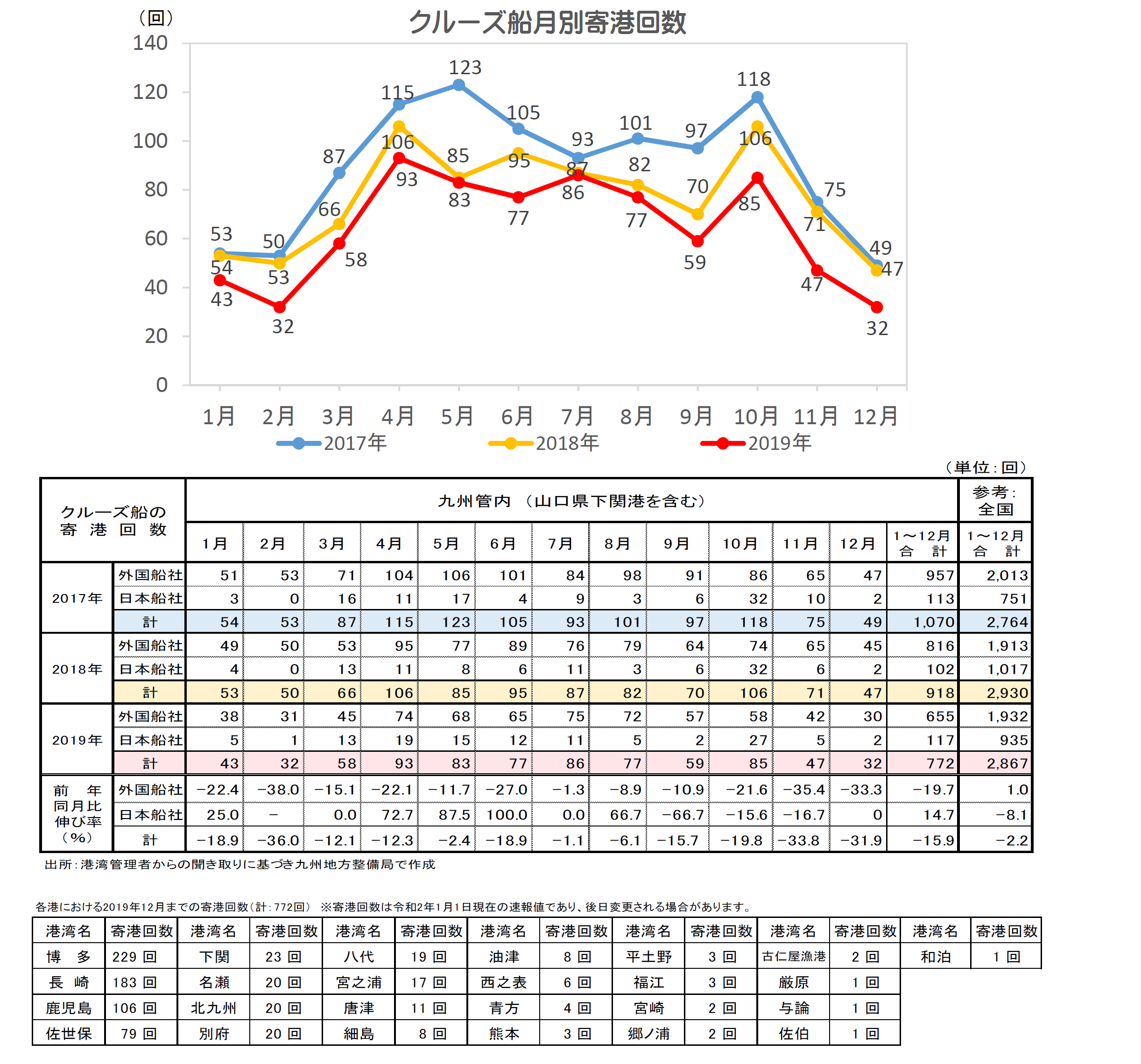 ・2019年12月までの九州管内港湾におけるクルーズ船寄港回数は、前年同期比15.9%減の772回。