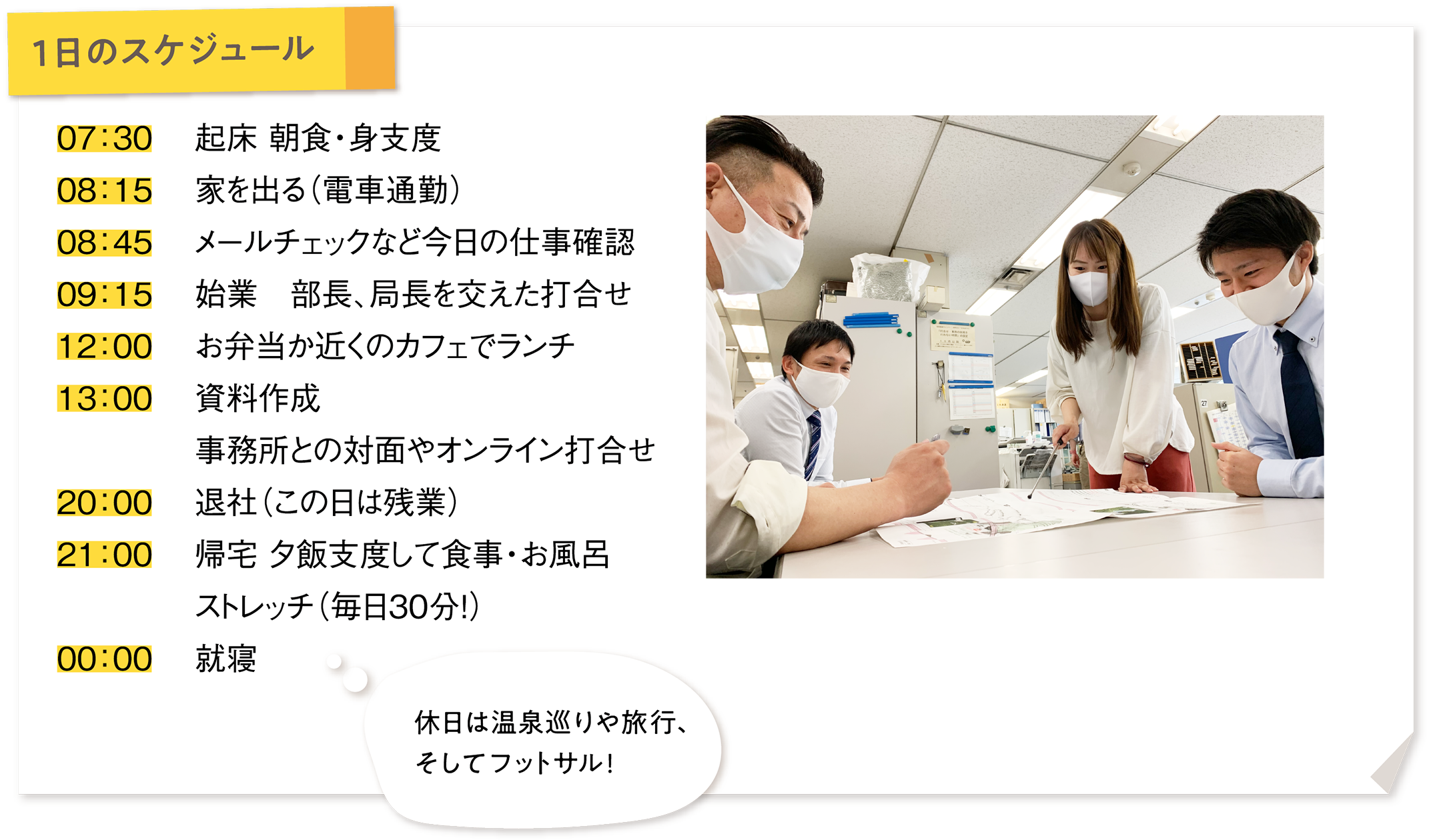 やっている仕事入省以来、歩道整備や交差点改良等の交通安全対策事業、中九州横断道路の工事の設計・積算に携わり、今は、新しい道路の調査や計画、道路事業の予算や復興関係の業務を担当しています。最近、自分が携わってきた道路をプライベートで通りましたが、当時を思い出され胸がいっぱいになりました。予算も規模も大きい事業に携わることができ、とてもやりがいのある仕事をしているなと実感しています。