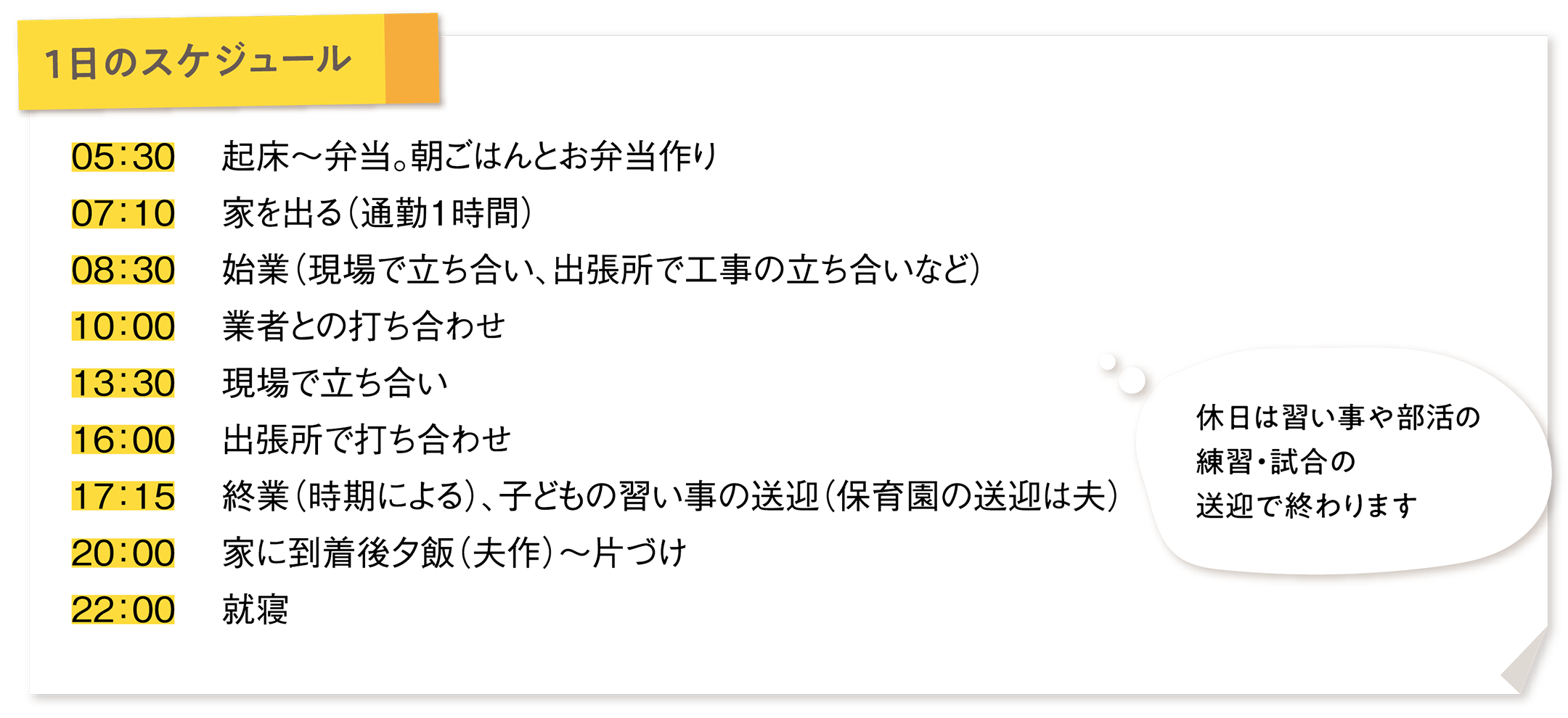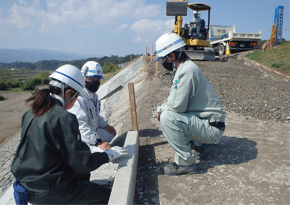 やっている仕事入省以来、河川や砂防の整備・計画・調査を経験し、今は、小丸川工事の現場監督をして2年になります。現場に出るようになり、毎日が楽しく、夢が実現しています。霧島火山の砂防ダム勤務の時に育休中、1級土木施工管理技士の資格を取得しました。育休中は職場を離れているのが怖く不安なのですが、職場の同僚や先輩とコミュニケーションをとりながらその資格取得に取り組めたことに感謝しています。