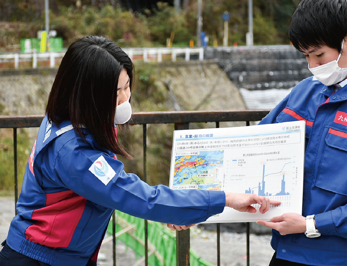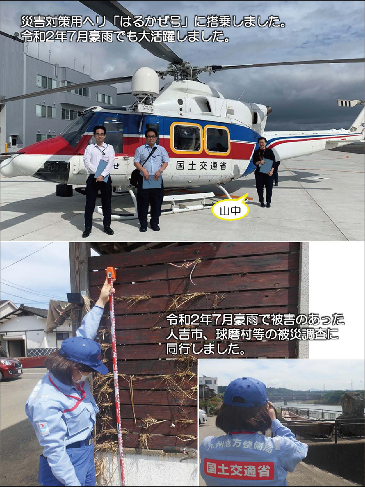 やっている仕事管轄している球磨川流域が令和2年7月豪雨災害に遭いました。崩れた河川の堤防や護岸だけでも100カ所以上。私は、被災した護岸、施設の工事設計や土砂の撤去工事の設計を担当しています。被災された地域の方が、「今は被災して被災住宅に住んでいるけれども、小さい頃から球磨川で遊んで身近にあった川だから、球磨川を嫌いにはなれない。球磨川は好きなんです」と話され、逆にありがたく、住民の方の気持ちを受け止めながら頑張りたいと思っています。