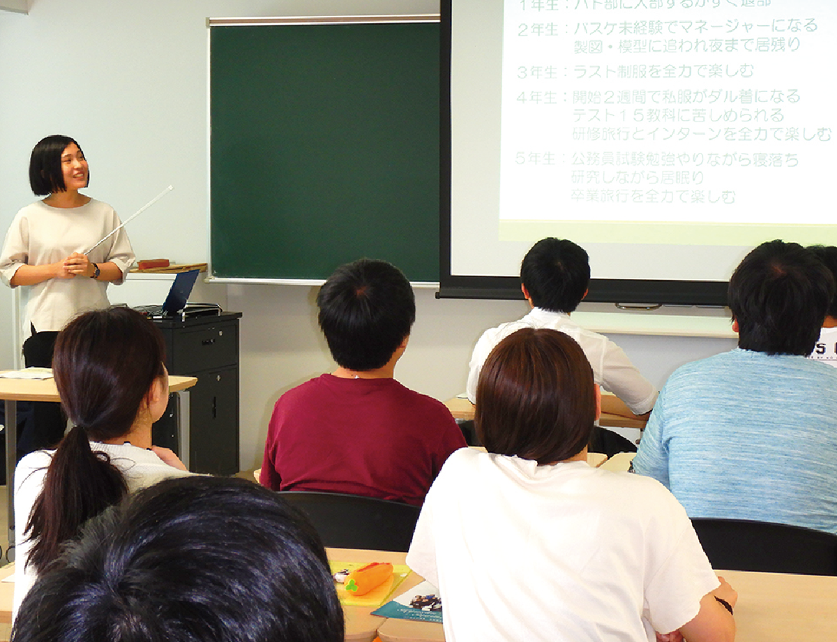 中高の理系に進学を希望する女子生徒に九州地方整備局の仕事について話をしています。