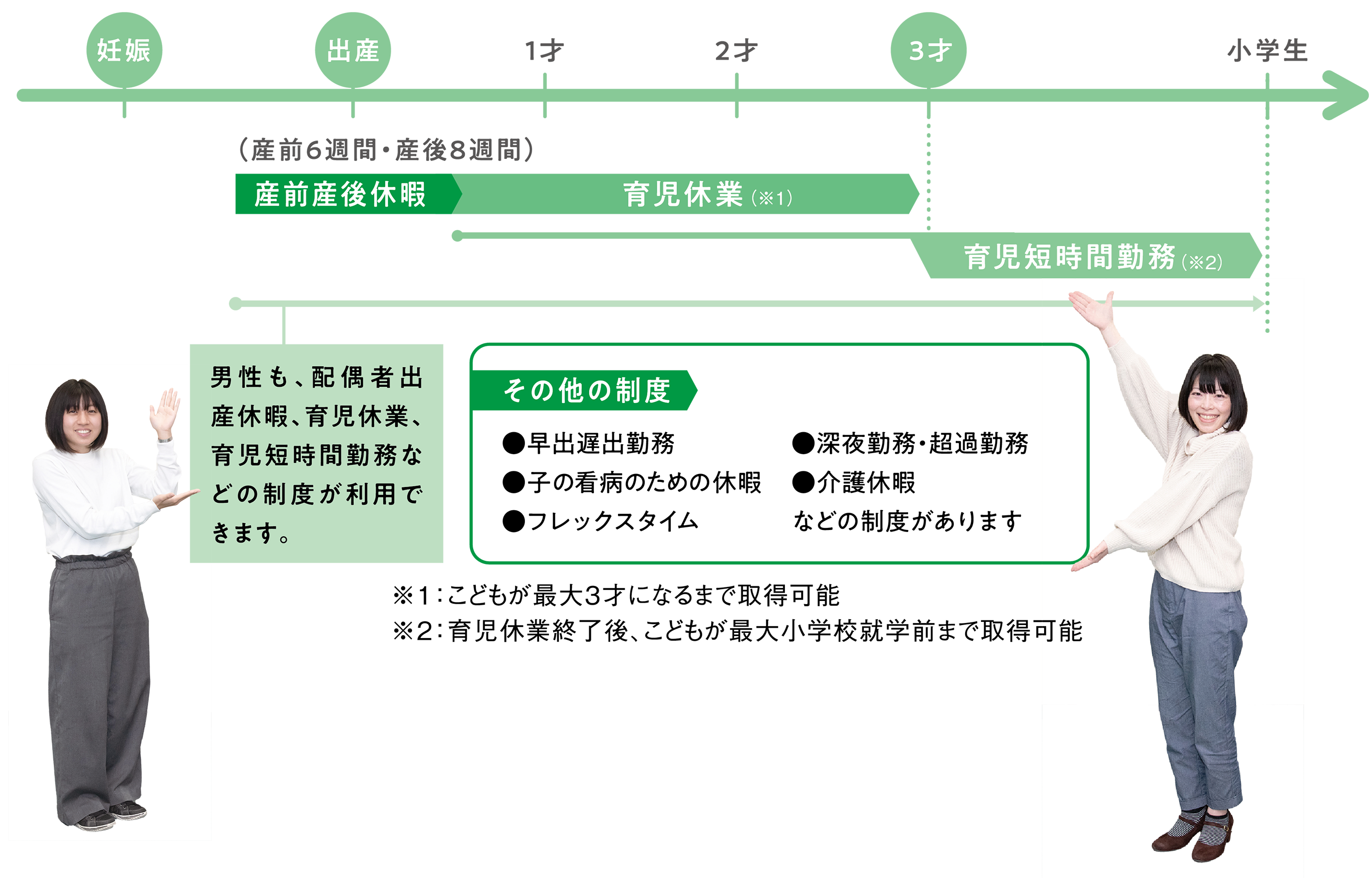 国家公務員の両立支援制度に基づき、子育て・介護の両立支援制度が充実しています。