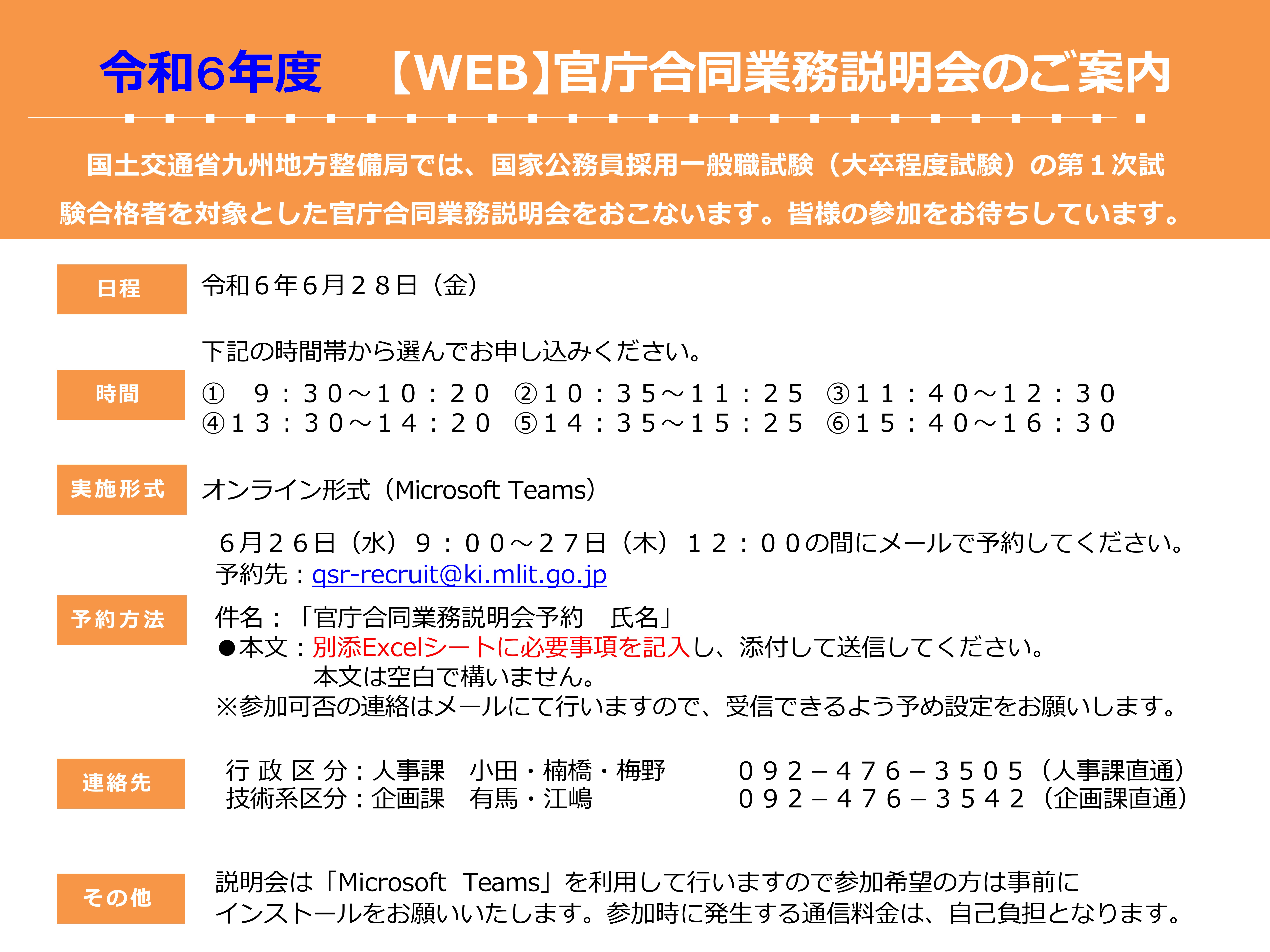 国土交通省九州地方整備局では、国家公務員採用一般職試験(大卒程度試験)の第1次試験合格者を対象とした官庁合同業務説明会を下記日時で開催致します。皆様のご参加をお待ちしております。