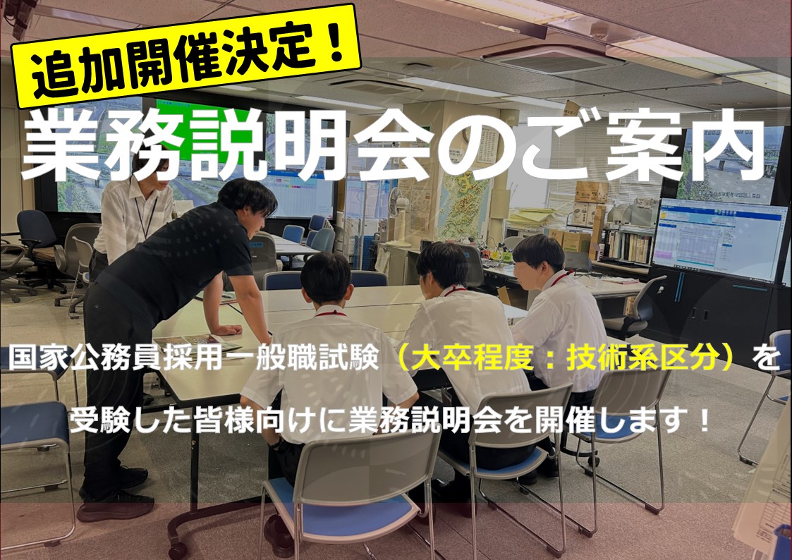 国⼟交通省九州地⽅整備局では、国家公務員採⽤⼀般職試験(⼤卒程度︓技術系区分※)を受験した皆様向けに業務説明会を開催します。
