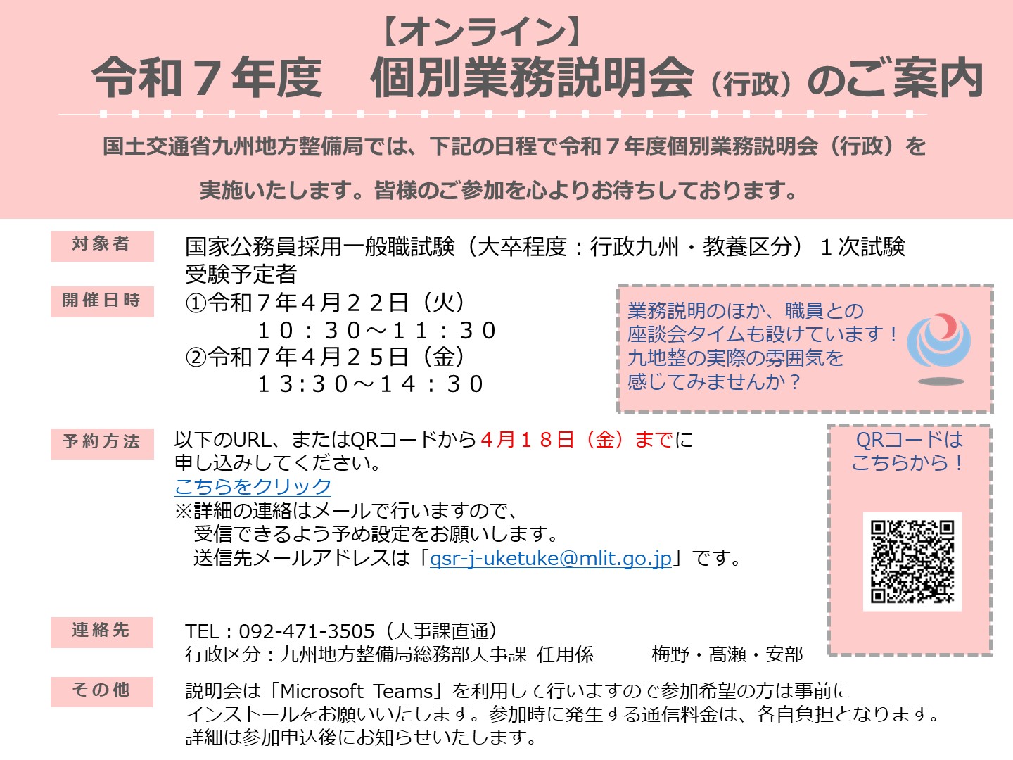 国土交通省九州地方整備局では、下記の日程で【オンライン】下記の日程で令和7年度個別業務説明会(行政)を実施致します。皆様のご参加を心よりお待ちしております。