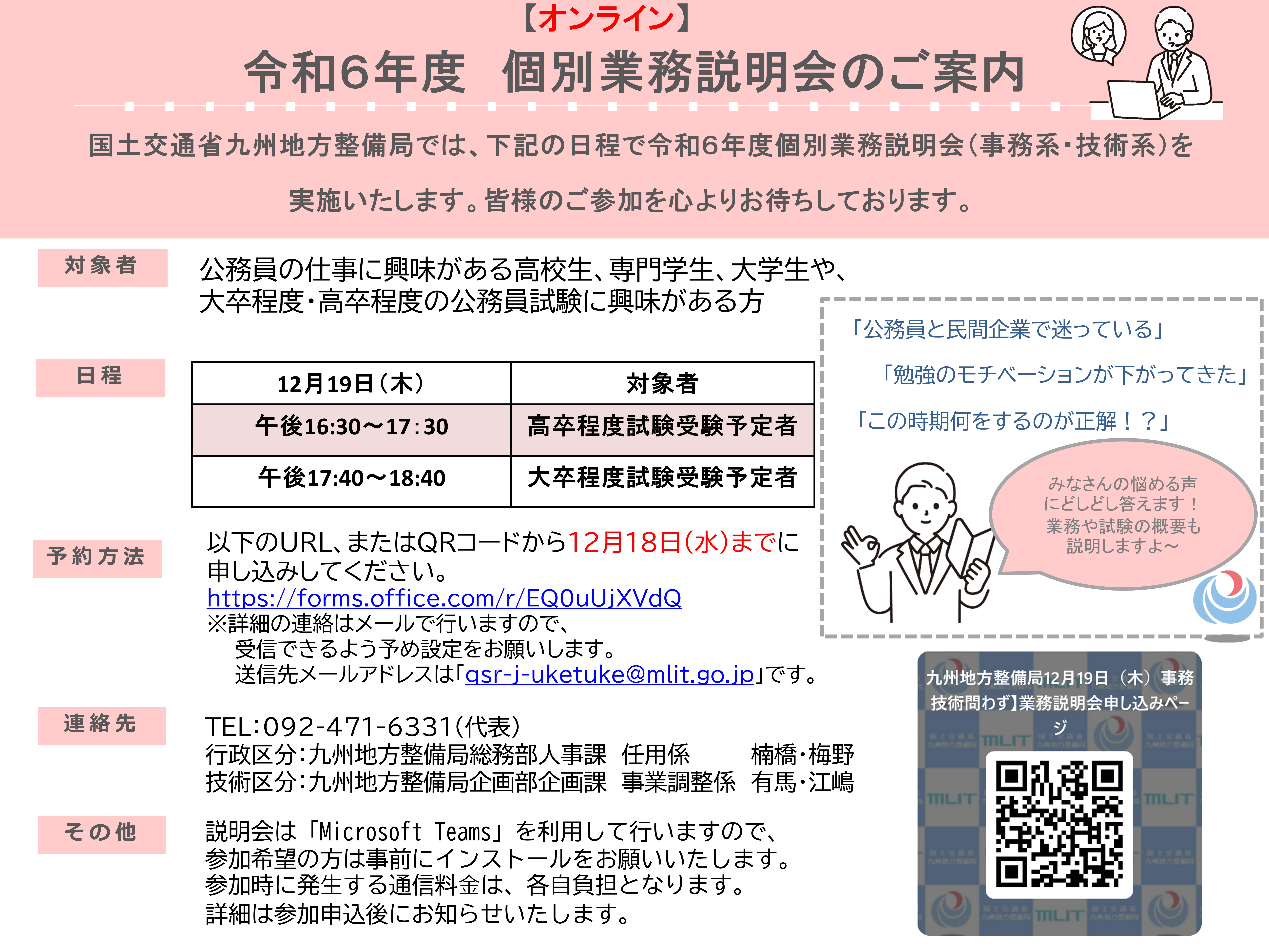 国土交通省九州地方整備局では、下記の日程で令和6年度個別業務説明会(事務系・技術系)を実施いたします。皆様のご参加を心よりお待ちしております。