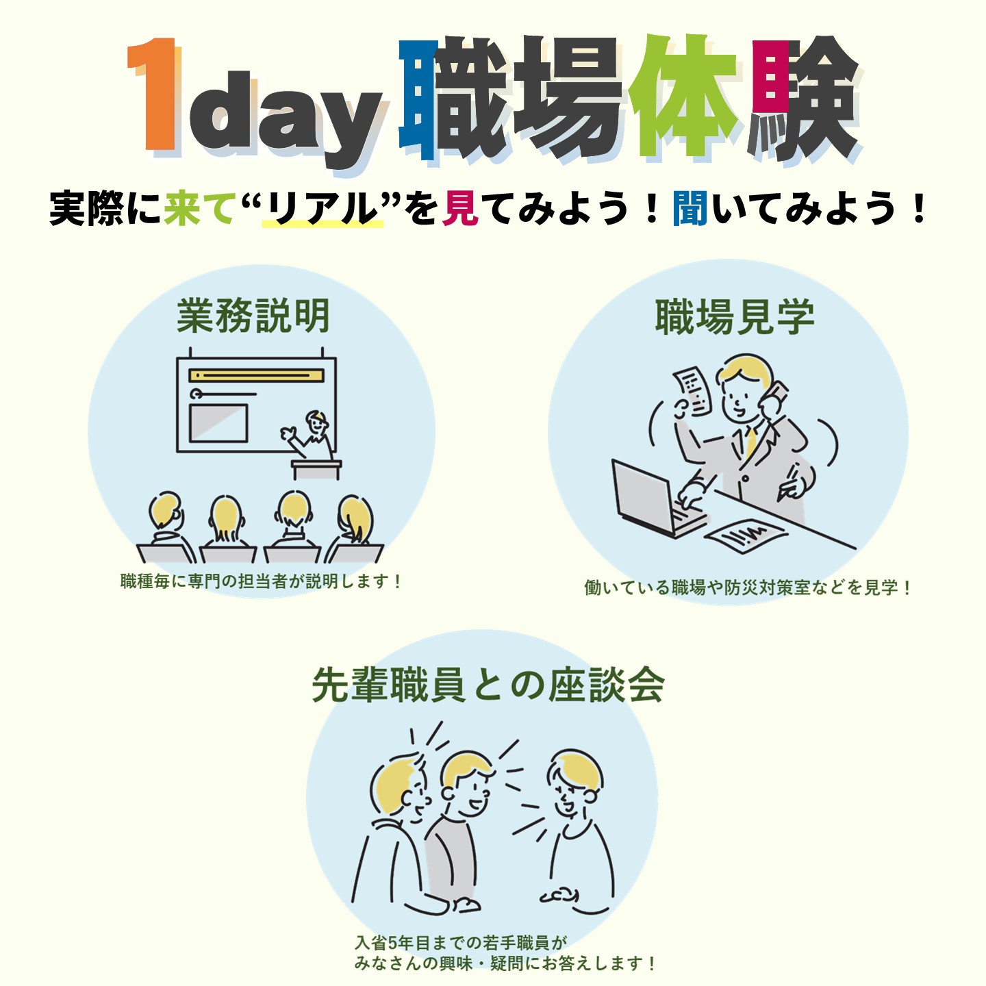 1日で職場見学・若手職員との座談会を通じて、公務員の働き方や職場の空気感を体験。