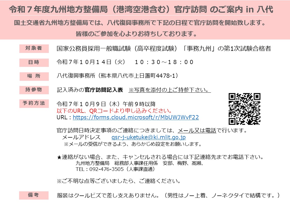 国土交通省九州地方整備局では、八代復興事務所にて官庁訪問を開催致します。