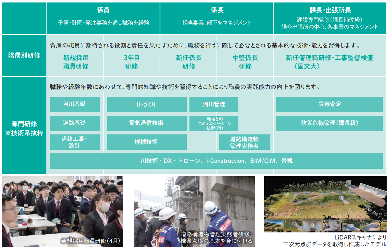 九州地方整備局では、入省すぐに国家公務員としての使命、役割を学ぶ新規採用職員研修を実施しています。その後も、職種各階層に応じた基礎的な研修や専門的な分野の研修を九州技術事務所(久留米市)で受けることができます。また、国土交通大学校(東京都小平市)などにおいて高度かつ広域的な研修を実施しています。