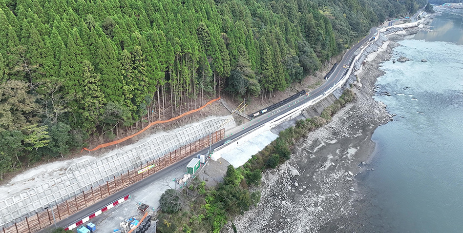 - 改良その1落石防護網施工中、改良その2,3嵩上げ工事施工中、