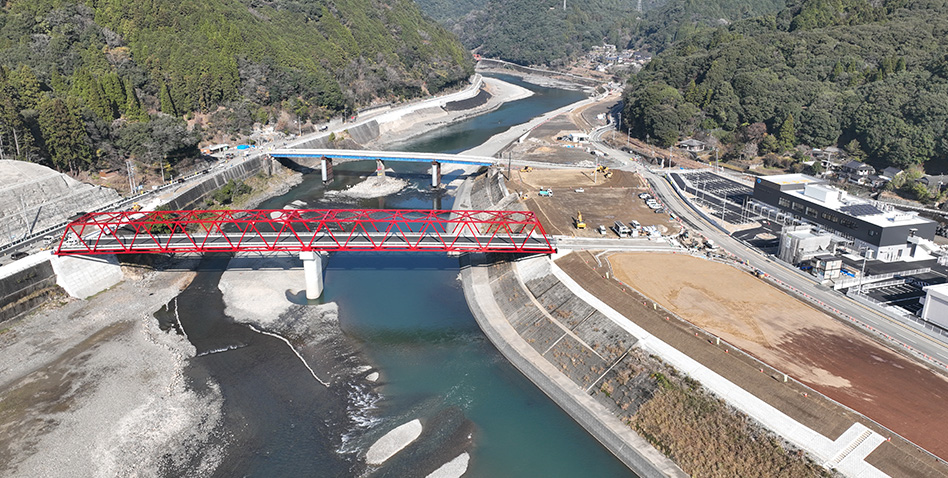 - 橋脚(P1)鉄筋・型枠組み立て中:迂回路整備完了