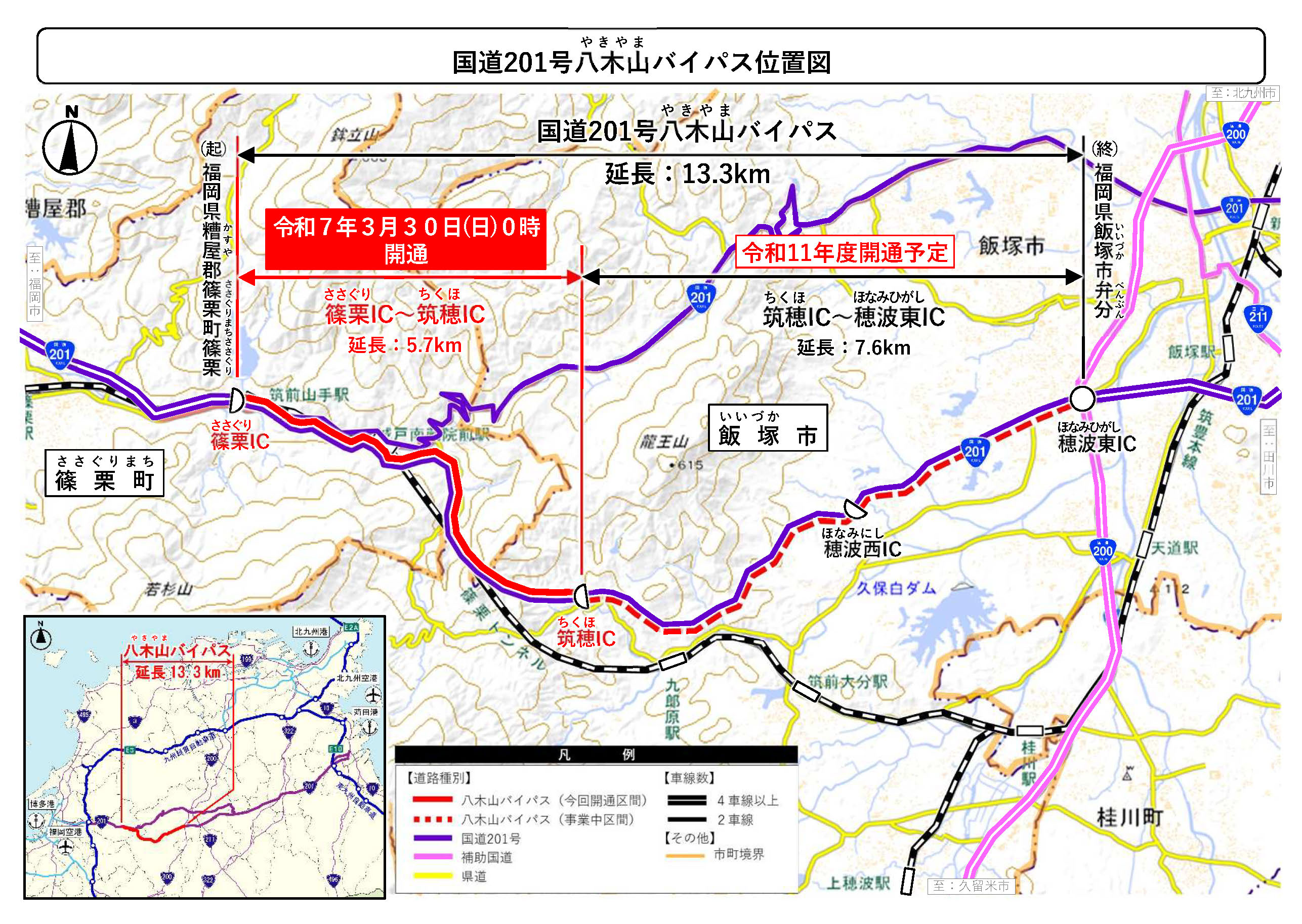 八木山バイパスは、福岡都市圏と飯塚市を結ぶ重要な路線ですが、4車線区間に挟まれたボトルネックのため交通渋滞が発生したり、対面通行のため正面衝突事故が多く発生している道路です。交通渋滞の緩和と道路利用者の安全・安心の確保を目的とし、平成31年度から直轄道路事業と有料道路事業により4車線化事業に着手し、令和7年3月30日から4車線の運用を開始しました。