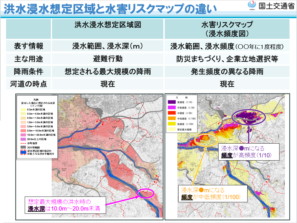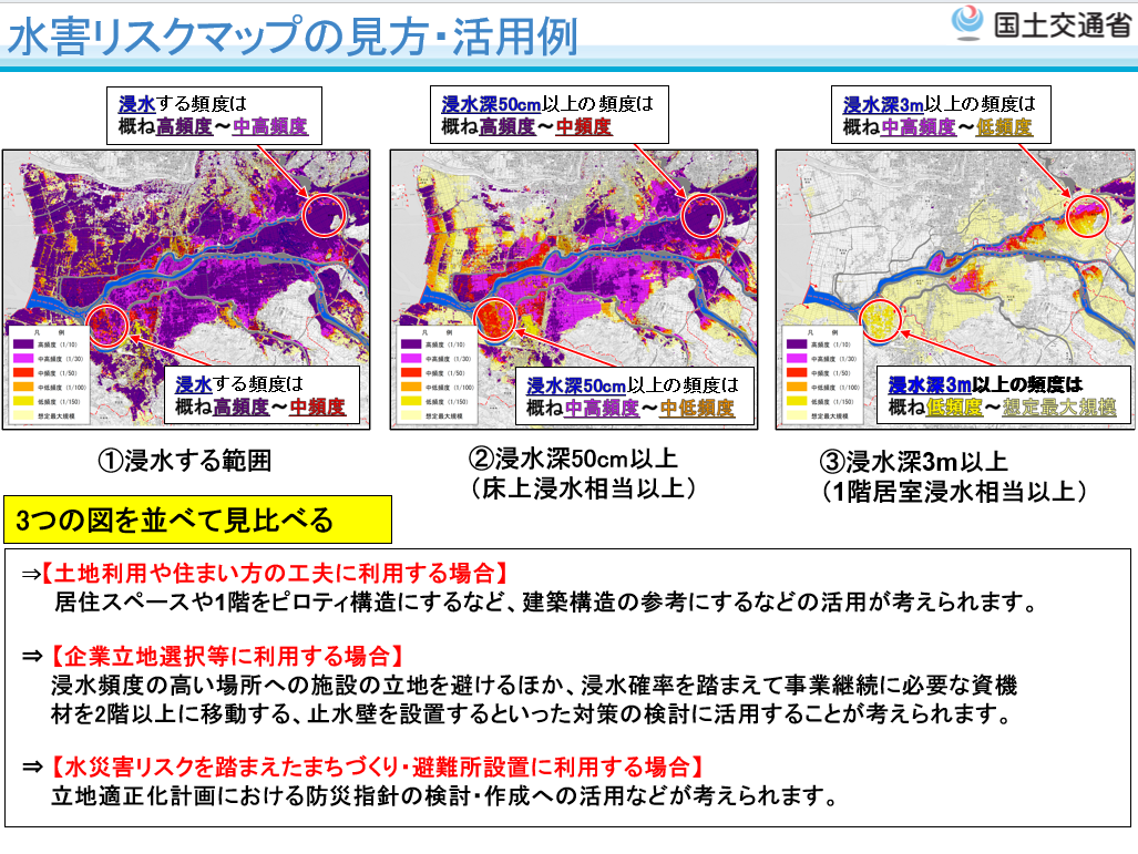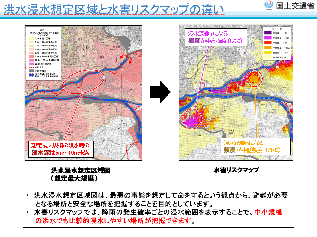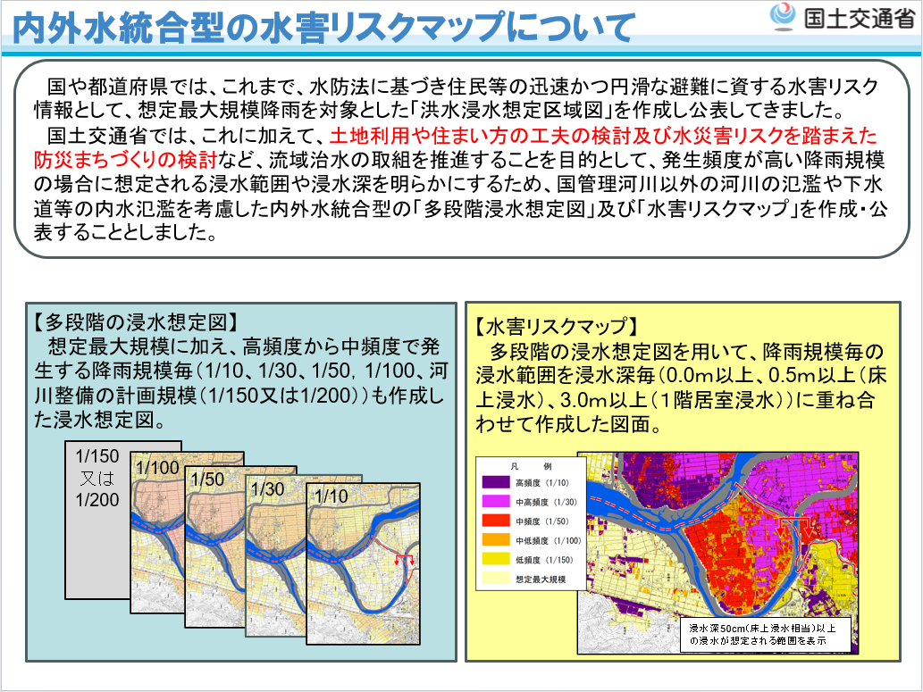 国土交通省では、これに加えて、土地利用や住まい方の工夫の検討及び水災害リスクを踏まえた防災まちづくりの検討など、流域治水の取組を推進することを目的として、発生頻度が高い降雨規模の場合に想定される浸水範囲や浸水深を明らかにするため、国管理河川以外の河川の氾濫や下水道等の内水氾濫を考慮した内外水統合型の「多段階浸水想定図」及び「水害リスクマップ」を作成・公表することとしました。