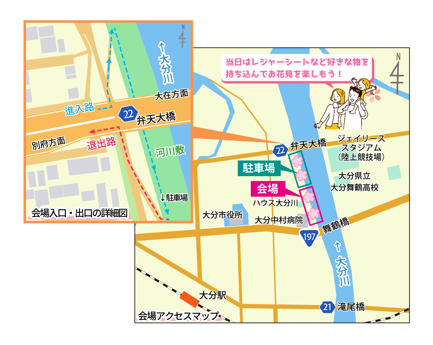 - 当日は大分川河川敷に無料駐車場を開放します。会場までの車の進入経路を十分にお確かめのうえ、ご来場ください。